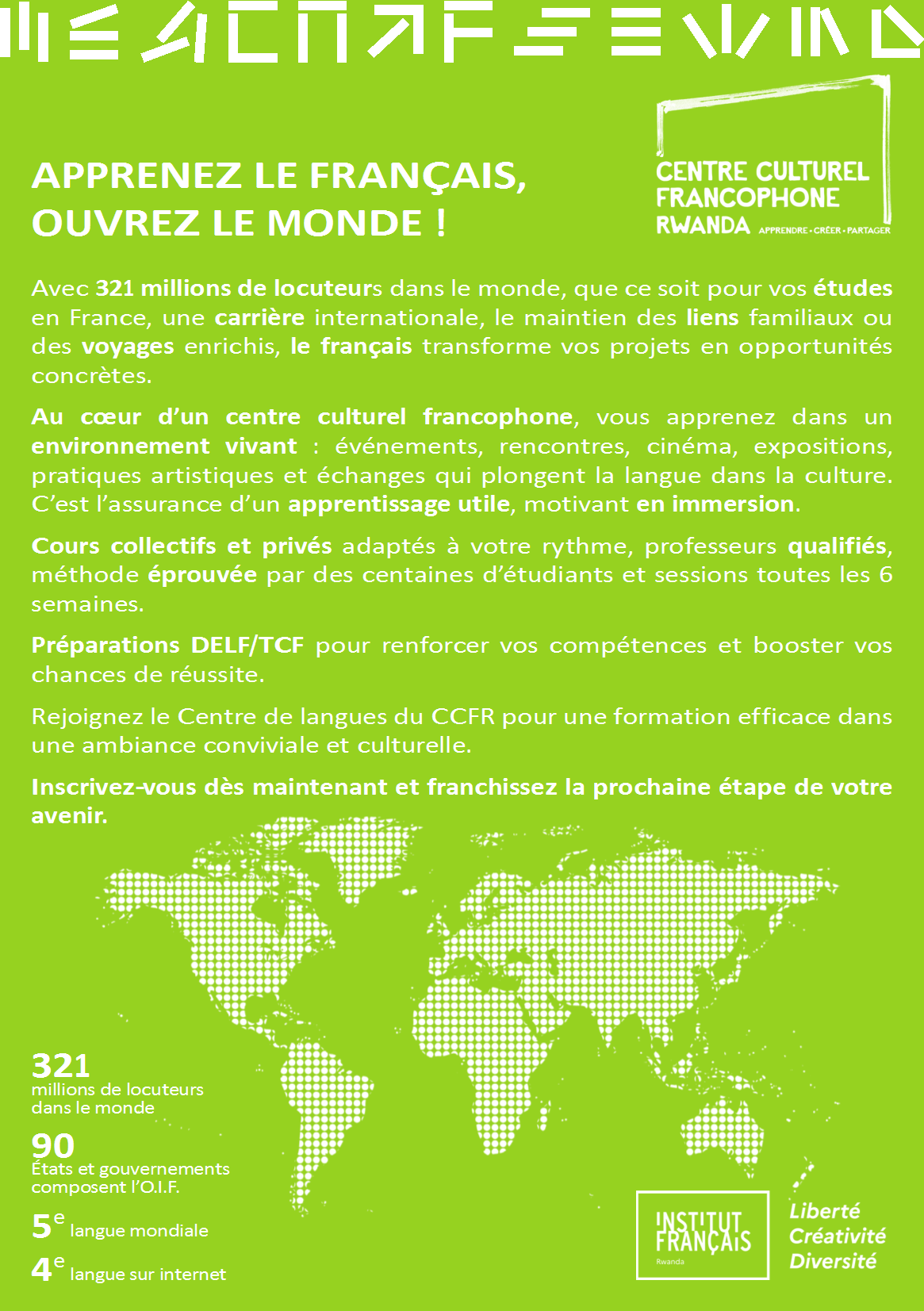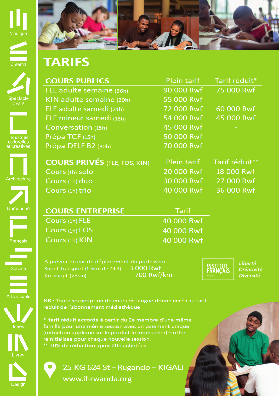 Inscris-toi aux prochains cours de français organisés par l’Institut! Nous proposons différents types de cours selon ton niveau: débutant, intermédiaire, préparation aux examens DELF B2 ou TCF, cours privés ou encore cours de Kinyarwanda!
